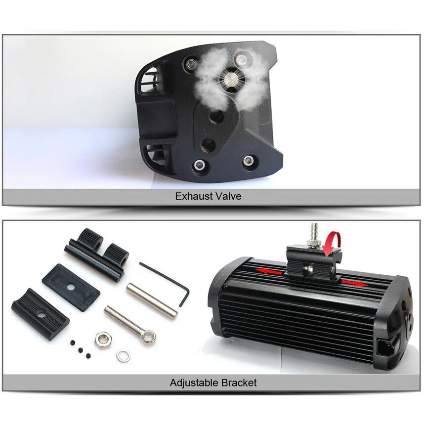 Bara LED Auto Offroad 30W 6D 12V-24V, 3240 Lumeni, 8"/20,5 cm Specificatii produs: Putere: 30W Luminozitate: 3240 lumeni Numar leduri: 12 CREE LED Tensiunea de lucru: 10-30V Clasa protectie: IP 67 Temperatura culoare lumina: 6000K Material: Aliaj Aluminiu Culoare corp: Negru Material lentila: Policarbonat (rezistenta mare la socuri mecanice si termorezistenta) Bracketi montaj: Duraluminiu Unghi lumina: 120 grade Lungime: 8 inch (cca 21,5 cm) Durata de viata: > 30.000 ore Descriere produs: Proiector LED auto pentru Off Road, vanatoare, pescuit, utilaje etc pentru utilizare la autoturisme, utilaje, camioane, ambarcatiuni Gama larga de utilizar: autoturisme, utilaje, camioane, ambarcatiuni si alte. Diferite dimensiuni pentru instalare in diverse locuri Durata de viata foarte mare, de peste 30.000 de ore de functionare Carcasa din duraluminiu rezistenta la socuri Protectie la apa si anticoroziune: poate fi utilizat in ploaie si in medii grele de lucru (praf, noroi etc) Unghi lumina: Combo - combina tipul spot cu tipul flood. Pe laterale are leduri tip flood cu unghiul de 60 grade, iar central leduri tip spot cu unghiul de 12 grade (vezi fotografia suplimentara a produsului) Garantie 6 luni