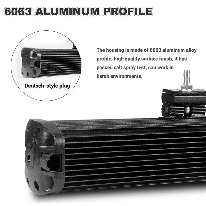 Bara LED Auto Offroad 90W 6D 12V-24V, 9720 Lumeni, 21"/53.5 cm + cablaj alimentare cu releu, siguranta si buton ON/OFF Specificatii produs: Putere: 900W Luminozitate: 9720 lumeni Numar leduri: 36 CREE LED Tensiunea de lucru: 10-30V Clasa protectie: IP 67 Temperatura culoare lumina: 6000K Material: Aliaj Aluminiu Culoare corp: Negru Material lentila: Policarbonat (rezistenta mare la socuri mecanice si termorezistenta) Bracketi montaj: Duraluminiu Unghi lumina: 120 grade Lungime: 21 inch (cca 53.5 cm) Durata de viata: > 30.000 ore Descriere produs: Proiector LED auto pentru Off Road, vanatoare, pescuit, utilaje etc pentru utilizare la autoturisme, utilaje, camioane, ambarcatiuni Gama larga de utilizar: autoturisme, utilaje, camioane, ambarcatiuni si alte. Diferite dimensiuni pentru instalare in diverse locuri Durata de viata foarte mare, de peste 30.000 de ore de functionare Carcasa din duraluminiu rezistenta la socuri Protectie la apa si anticoroziune: poate fi utilizat in ploaie si in medii grele de lucru (praf, noroi etc) Unghi lumina: Combo - combina tipul spot cu tipul flood. Pe laterale are leduri tip flood cu unghiul de 60 grade, iar central leduri tip spot cu unghiul de 12 grade (vezi fotografia suplimentara a produsului)