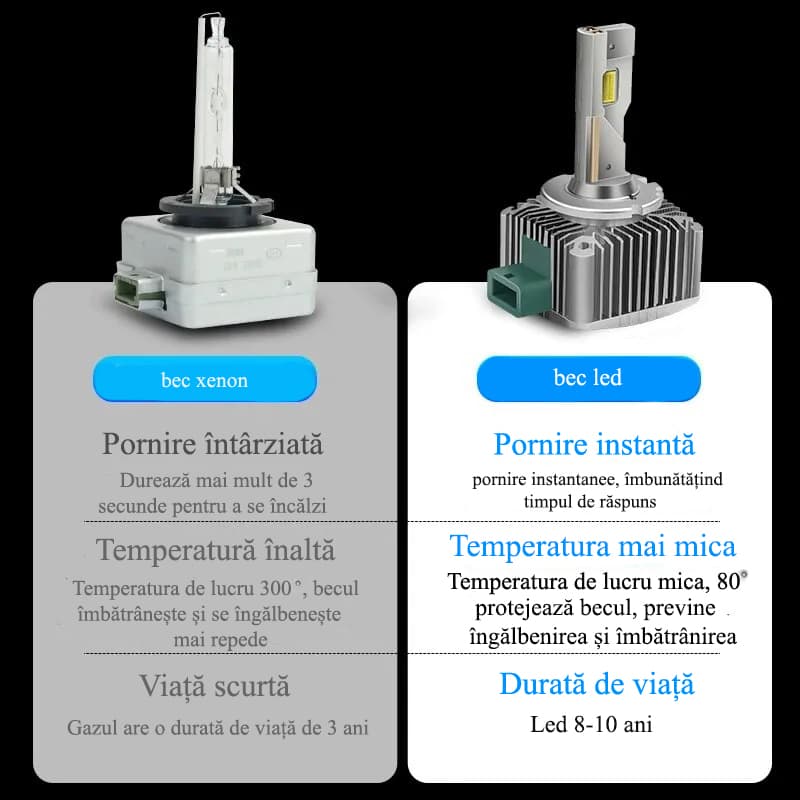 Specificatii: Becuri LED compatibil: D1S Voltaj: DC 9-85V Putere: 70W/set Temperatura de culoare (culoare): 6000K Alb Instalare usoara: inlocuire directa pentru plug and play Canbus si fara avertisment de eroare, fara palpaire Unghiul fasciculului: 270°