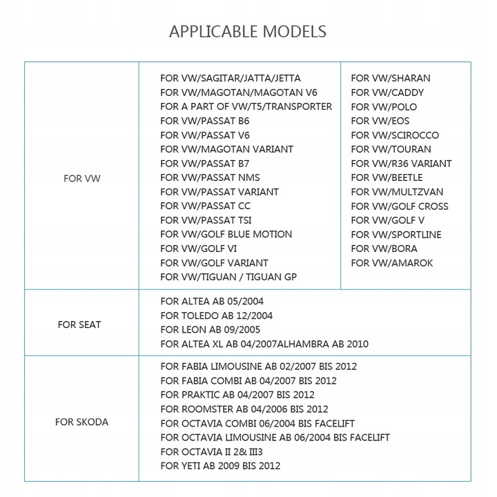 VW: Passat B6, Passat B7, Pasat CC, Golf 2003-2013, Golf Plus 2003-2009, Scirocco 2008-2011, Tiguan 2007-2015, Touran 2003-2013, Caddy 2004-2011, Jetta 2005-2011, Transporter 2007-2011, Multivan 2007-2011, Caravalle 2010-2015, EOS 2006-2011, Polo 2006-2015, Sharan 2010-2013, Amarok 2010-2015, Beetle 2012-2015