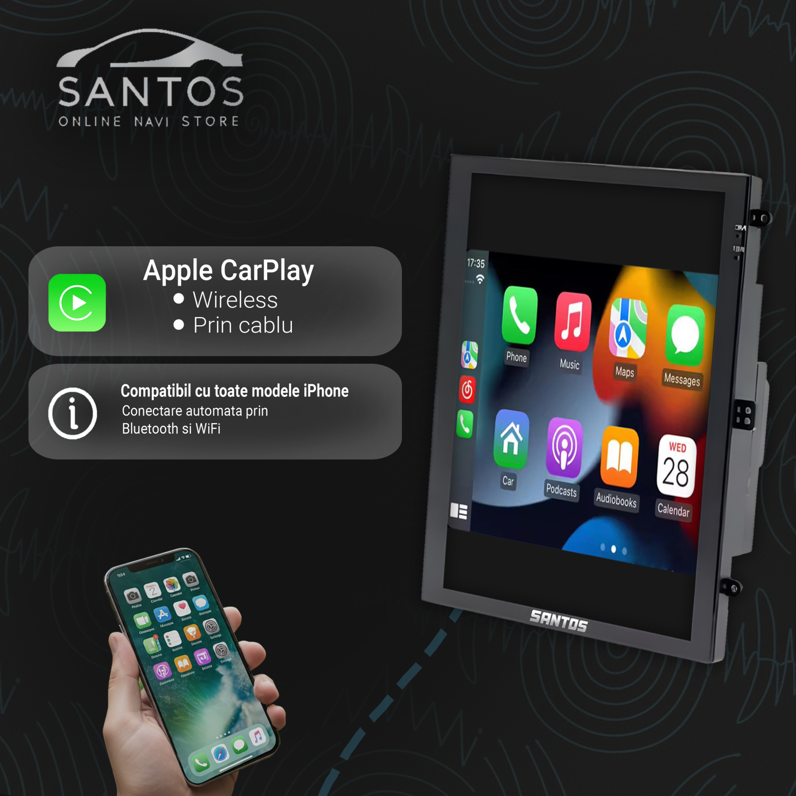 Navigația are Wireless CarPlay și Android Auto integrate. Te conectezi fără cablu și folosești direct Google Maps, Waze, Spotify sau apeluri handsfree.