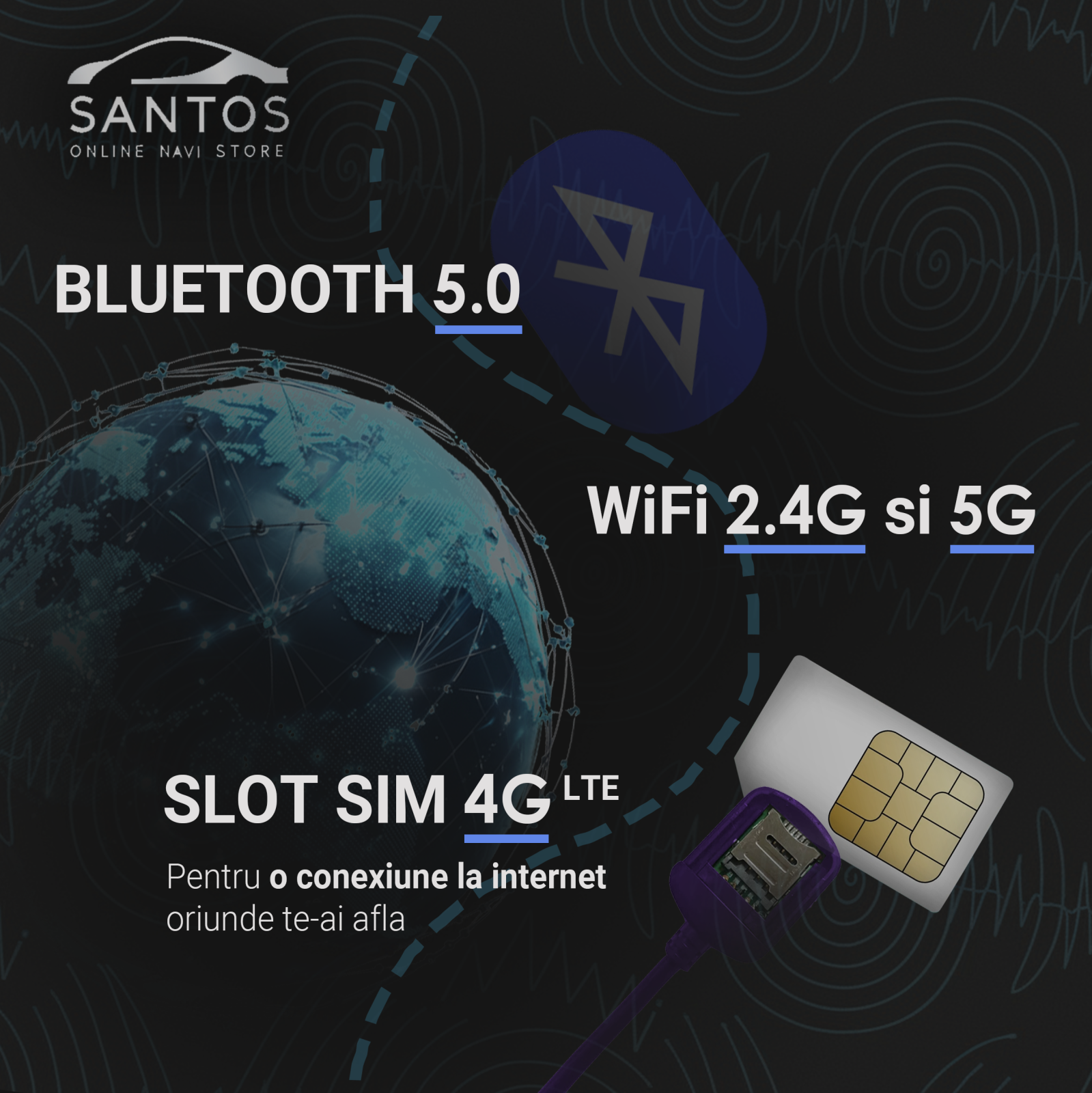 Navigatia GPS integrata suporta aplicatii online si offline. Modulul Bluetooth 5.0 asigura apeluri clare si streaming audio stabil. Conectivitatea WiFi duala 2.4 GHz si 5.0 GHz ofera viteza buna pentru aplicatii si actualizari.