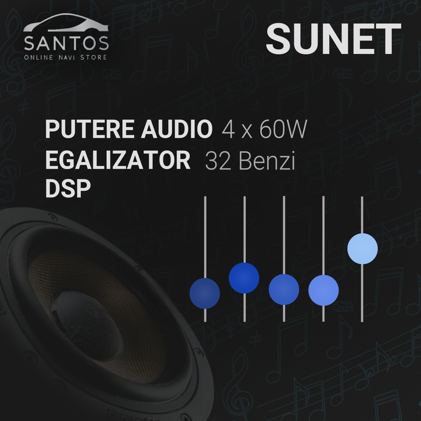 Sunetul este controlat de DSP cu egalizator pe 32 benzi. Ajustezi frecventele exact cum vrei. Amplificarea audio 4x60W ofera volum si claritate chiar si la viteze mari.
