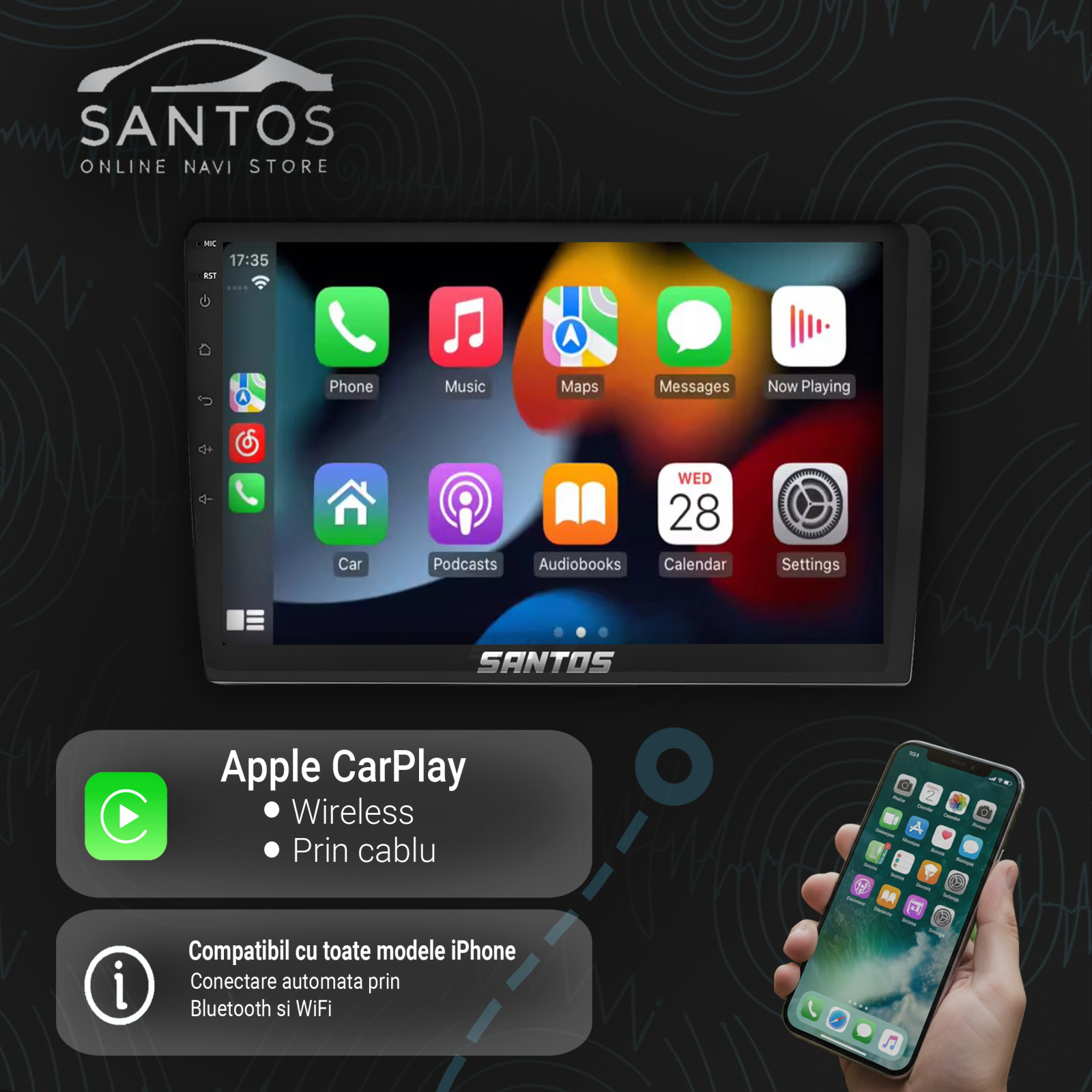 Wireless CarPlay si Android Auto functioneaza fara cablu. Conectezi telefonul instant si folosesti Google Maps, Waze, Spotify sau apeluri handsfree direct pe ecran.