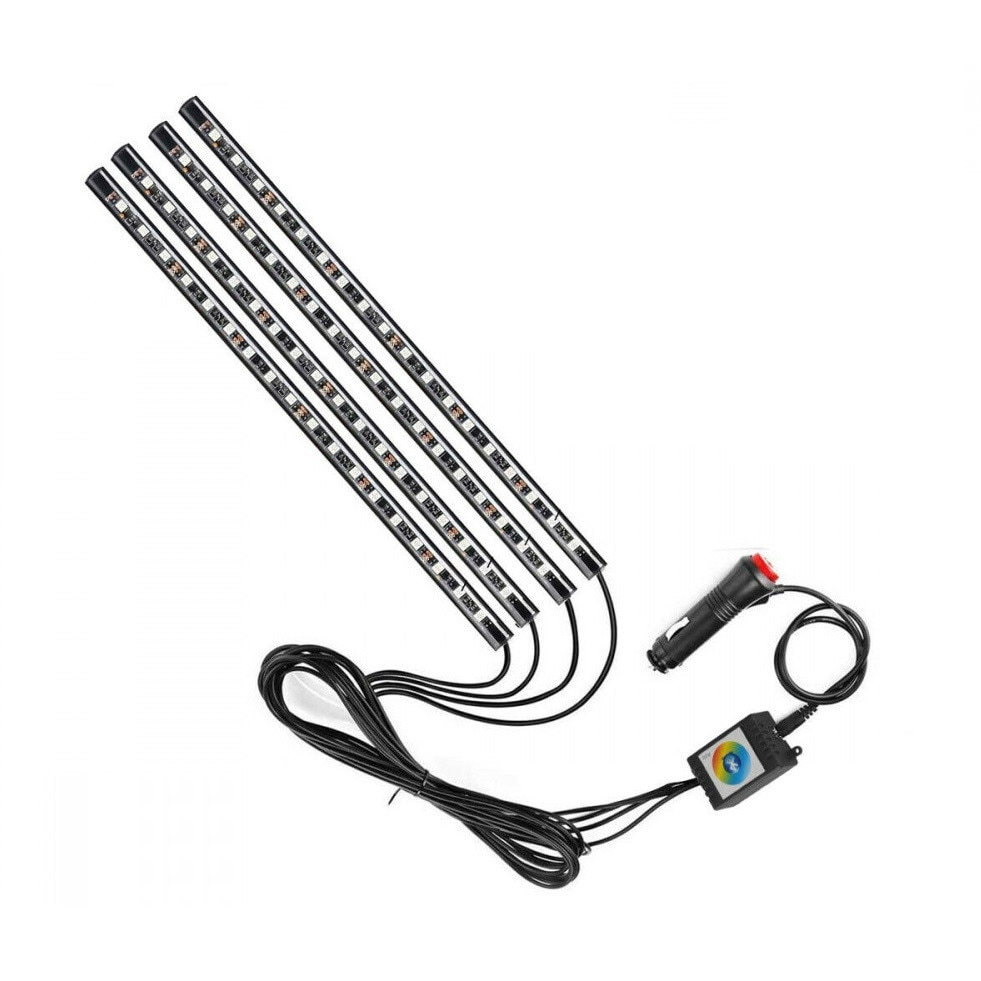Kit 4 Lumini Ambientale RGB cu Aplicatie Telefon Bluetooth, 12V, 12 LED, 22 cm Control wireless Descarcati gratuit aplicatia scanand codul QR (compatibil cu iPhone si Android) Activati Bluetooth Conectati-va prin Bluetooth Deschideti aplicatia pentru a alege modurile care va plac Caracteristici: 12 leduri RGB pe fiecare din cele 4 module Lungime modul de 22 cm Alimentare la 12V Pachetul contine: - 4 lampi cu led - unitate de control - mufa bricheta (poate fi inlaturata daca se doreste sa se lege direct)
