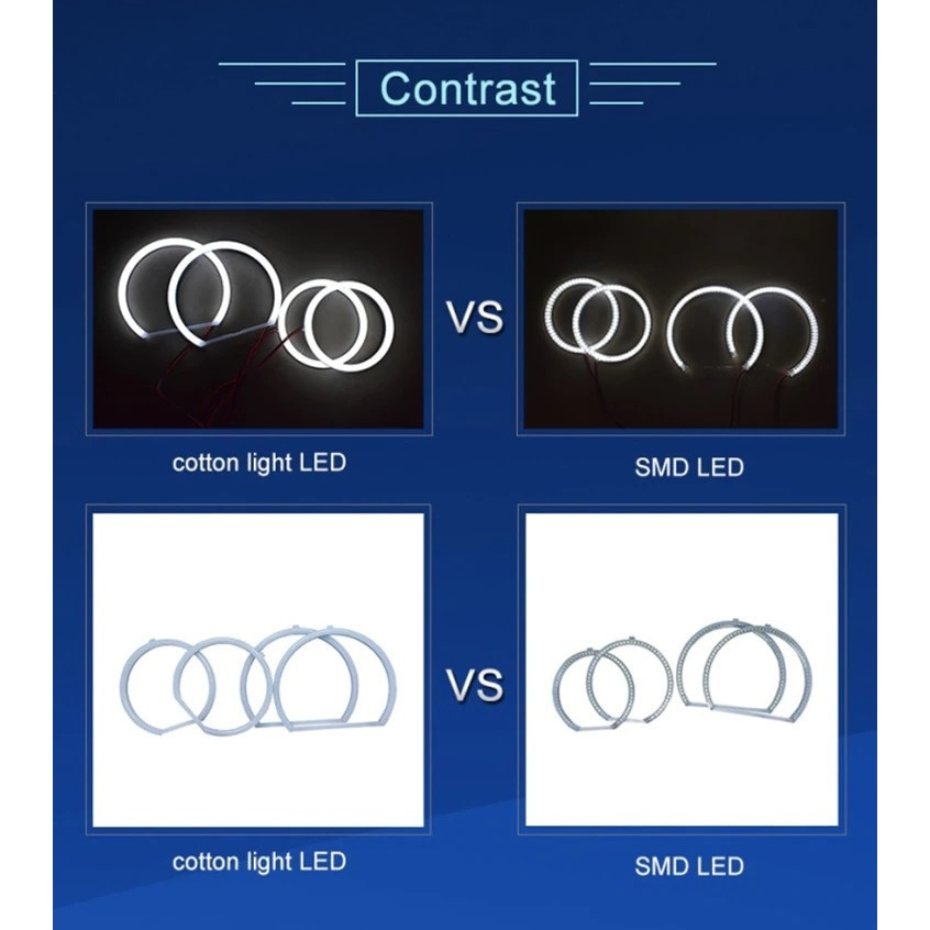 Kit Angel Eyes LED COTTON pentru BMW E46 Coupe/Cabrio cu Facelift (2003 - 2006), far cu lupa 4x106mm Kitul contine: - 4 inele Angel Eyes Cotton - cabluri si accesorii pentru montare Avantaje: - tehnologie de ultima generatie cu lumina uniforma de inalta putere - cu aproximativ 30-40% mai puternice decat cele cu tehnologie neon CCFL - nu mai necesita ridicatoare de tensiune - foarte usor de montat - lumina foarte puternica vizibila si intr-o zi insorita - fara erori de bec ars in bord Dimensiuni inele: 4x106mm