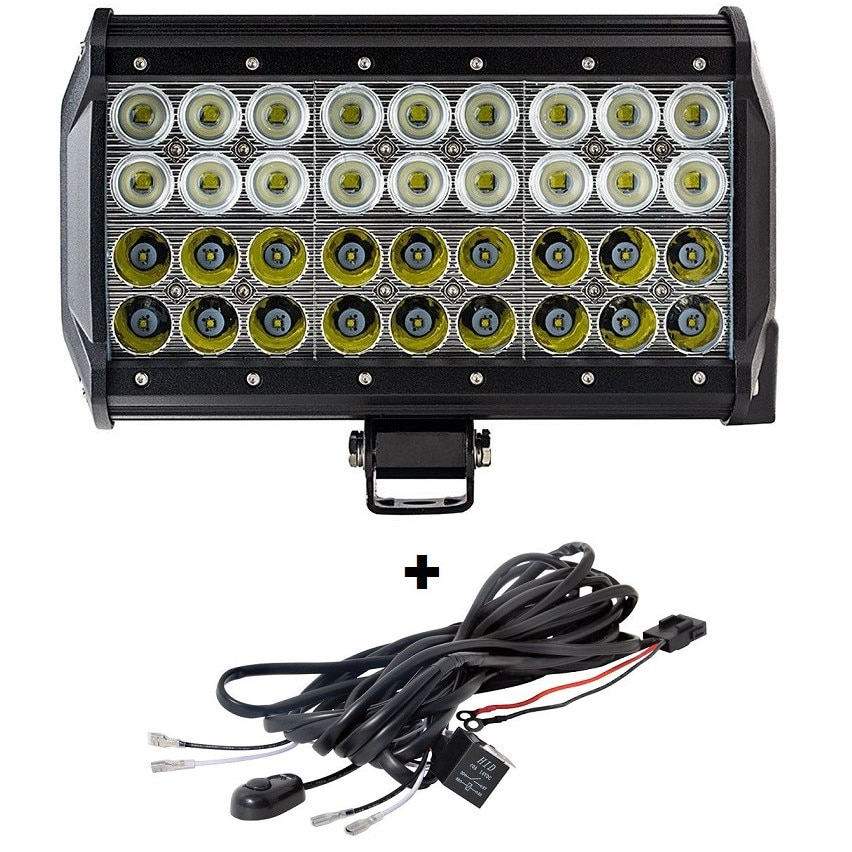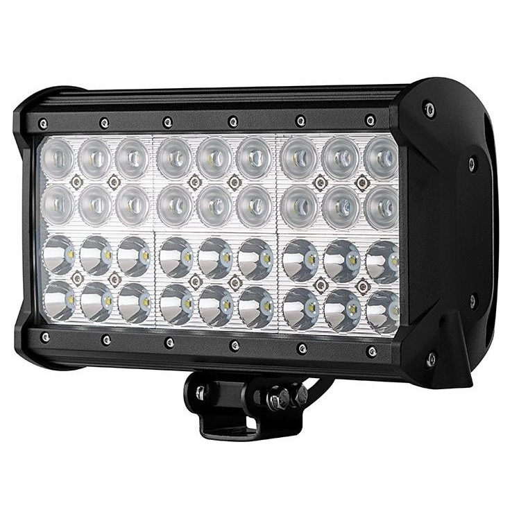 Bara cu leduri cu 2 faze (faza scurta/faza lunga), putere 108W/12V-24V, 9180 Lumeni, lungime 23,5 cm, Leduri CREE Led bar auto cu 4 randuri de leduri, cu faza scurta si faza lunga Cablaj cu Releu si Buton On/Off inclus Specificatii produs: Putere: 108W Luminozitate: 9180 lumeni Numar leduri: 36x3W high intensity CREE XBD LED Tensiunea de lucru: 9-32V DC Clasa protectie: IP 67 Temperatura culoare lumina: 6000K Material: Aliaj Aluminiu Culoare corp: Negru Material lentila: Policarbonat Bracketi montaj: Duraluminiu Unghi lumina: Combo Beam (flood beam 60° pentru faza scurta si spot beam 12° pentru faza lunga) Dimensiuni: 235x93x167 mm Temperatura de lucru: -40°C ~ +85°C Durata de viata: > 30.000 ore Descriere produs: Proiector LED auto pentru Off Road, vanatoare, pescuit, utilaje etc pentru utilizare la autoturisme, utilaje, camioane, ambarcatiuni Gama larga de utilizar: autoturisme, utilaje, camioane, ambarcatiuni si alte. Diferite dimensiuni pentru instalare in diverse locuri Durata de viata foarte mare, de peste 30.000 de ore de functionare Carcasa din duraluminiu rezistenta la socuri Protectie la apa si anticoroziune: poate fi utilizat in ploaie si in medii grele de lucru (praf, noroi etc)