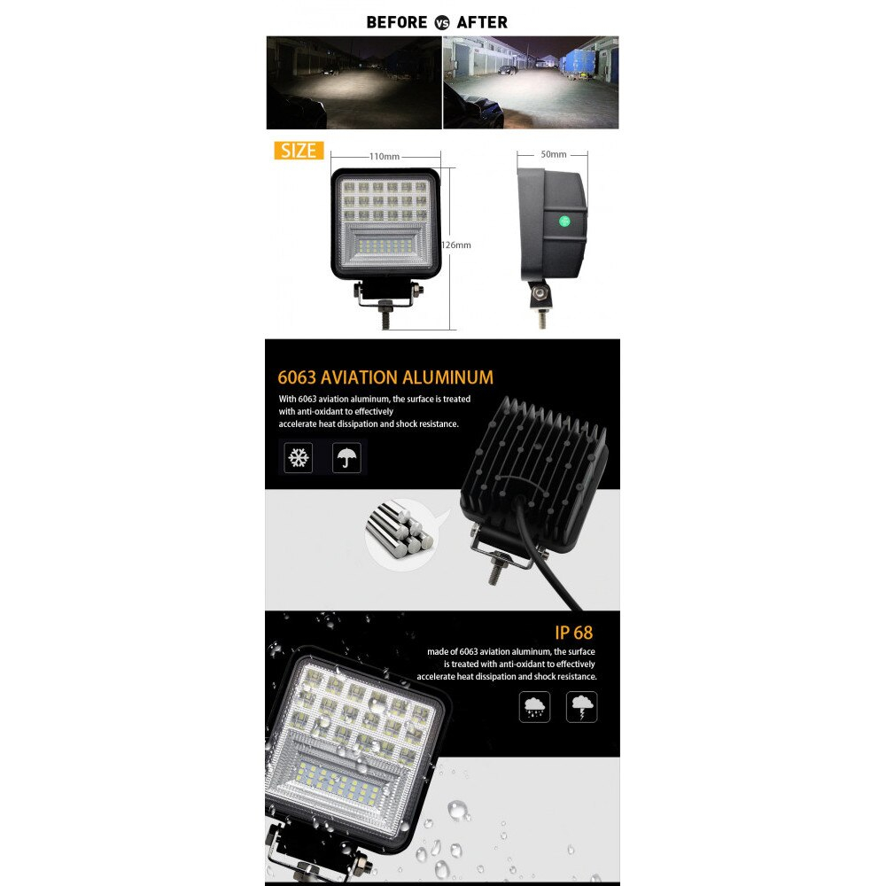 Proiector LED Auto Offroad 7D 63W/12V-24V, 5040 Lumeni, Patrat, Flood Beam 150 Grade Specificatii produs: Putere: 63W Luminozitate: 5040 lumeni Numar leduri: 42 high intensity Epsitar LED Tensiunea de lucru: 10-30V Clasa protectie: IP 67 Temperatura culoare lumina: 6000K Material: Aliaj Aluminiu Culoare corp: Negru Material lentila: Policarbonat Bracketi montaj: Otel inoxidabil Unghi lumina: Flood Beam 150° (de lucru) Dimensiuni: 110 x 110 x 70 mm Durata de viata: > 30.000 ore Descriere produs: Proiector LED auto pentru Off Road, vanatoare, pescuit, utilaje etc pentru utilizare la autoturisme, utilaje, camioane, ambarcatiuni Gama larga de utilizar: autoturisme, utilaje, camioane, ambarcatiuni si alte. Diferite dimensiuni pentru instalare in diverse locuri Durata de viata foarte mare, de peste 30.000 de ore de functionare Carcasa din duraluminiu rezistenta la socuri Protectie la apa si anticoroziune: poate fi utilizat in ploaie si in medii grele de lucru (praf, noroi etc)