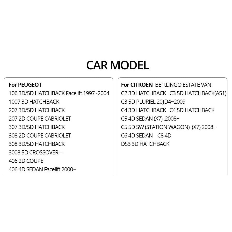 Schimbati rapid si usor culoarea galbena a lampilor de numar originale ale masinii. Lumina galbena a lampilor originale ale masinii este data de doua becuri halogen. Aceste becuri pot fi schimbate foarte simplu si usor cu noile lampi cu LED. Faceti o schimbare simpla dar de efect masinii personale! Specificatii: Temperatura culoare: 6000K Durata de viata: 50000 ore Nu dau eroare de bec ars (Canbus) Caracteristici: Lampa cu LEDuri smd Rezistenta la socuri si vibratii Consum redus de energie Instalare directa, fara alte modificari sau fire suplimentare Compatibilitate: BERLINGO ESTATE VAN C2 3D HATCHBACK C3 5D HATCHBACK(A51) C3 5D PLURIEL 2004~2009 C4 3D HATCHBACK C4 5D HATCHBACK C5 4D SEDAN(X7) 2008~ C5 5D SW(STATION WAGON) (X7) 2008~ C6 4D SEDAN C8 4D DS3 3D HATCHBACK Pretul este pe set *Inainte de a comanda verificati daca lampa dvs arata ca cea din poze.
