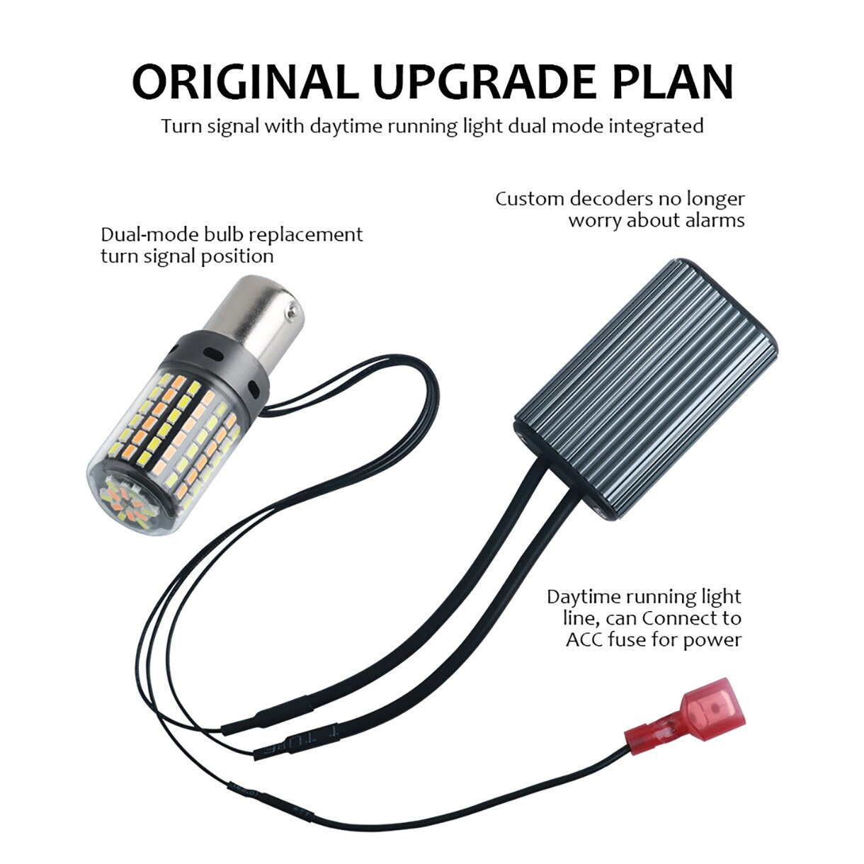 Set 2 leduri BAU15S PY21W cu dubla culoare: alb+portocaliu (lumina de zi si semnalizare) - BAU15S-114SMD-3014-AMBER+WHITE Specificatii: 144 smd 3014 decodor smart Plug and play - montaj fara modificari Lumina foarte puternica Pretul este pe kit (2 buc + accesorii)