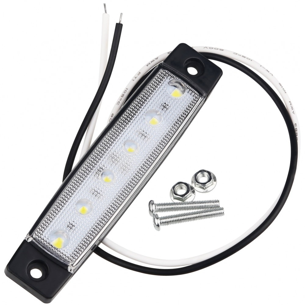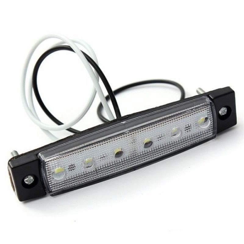 6x Lampi gabarit auto cu LED Caracteristici: Lampa de gabarit auto cu LED Tensiune alimentare: 24V Culoare lumina: Alba Numar leduri: 6 Leduri Lungime: 95mm Latime: 20mm Grosime: 8mm Distanta dintre gaurile de prindere: 85mm